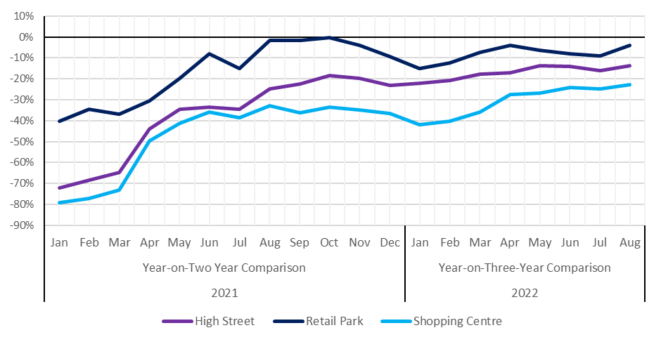 Since the pandemic started, much of retail has bounced between being open and closed, impacting footfall significantly. To make meaningful comparisons to changes in footfall, all figures are compared to their pre-pandemic (2019) levels. This means our 2022 figures are year-on-three-years (Yo3Y). However, we have provided year-on-year (YoY) figures in the first of the three tables. According to BRC-Sensormatic IQ data: