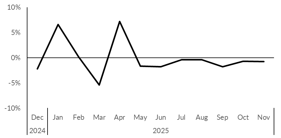 decreased by 1.2% in November (YoY), down from +0.6% in October.