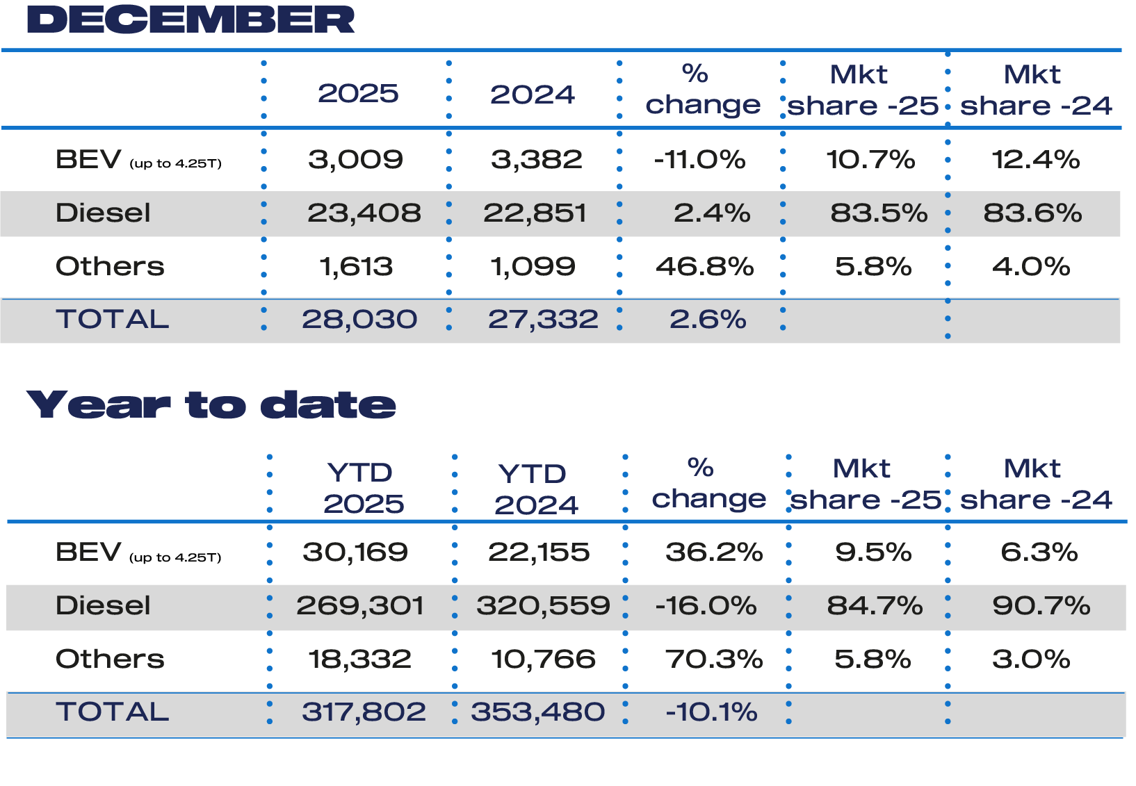 - New light commercial vehicle market declines by -10.3% with