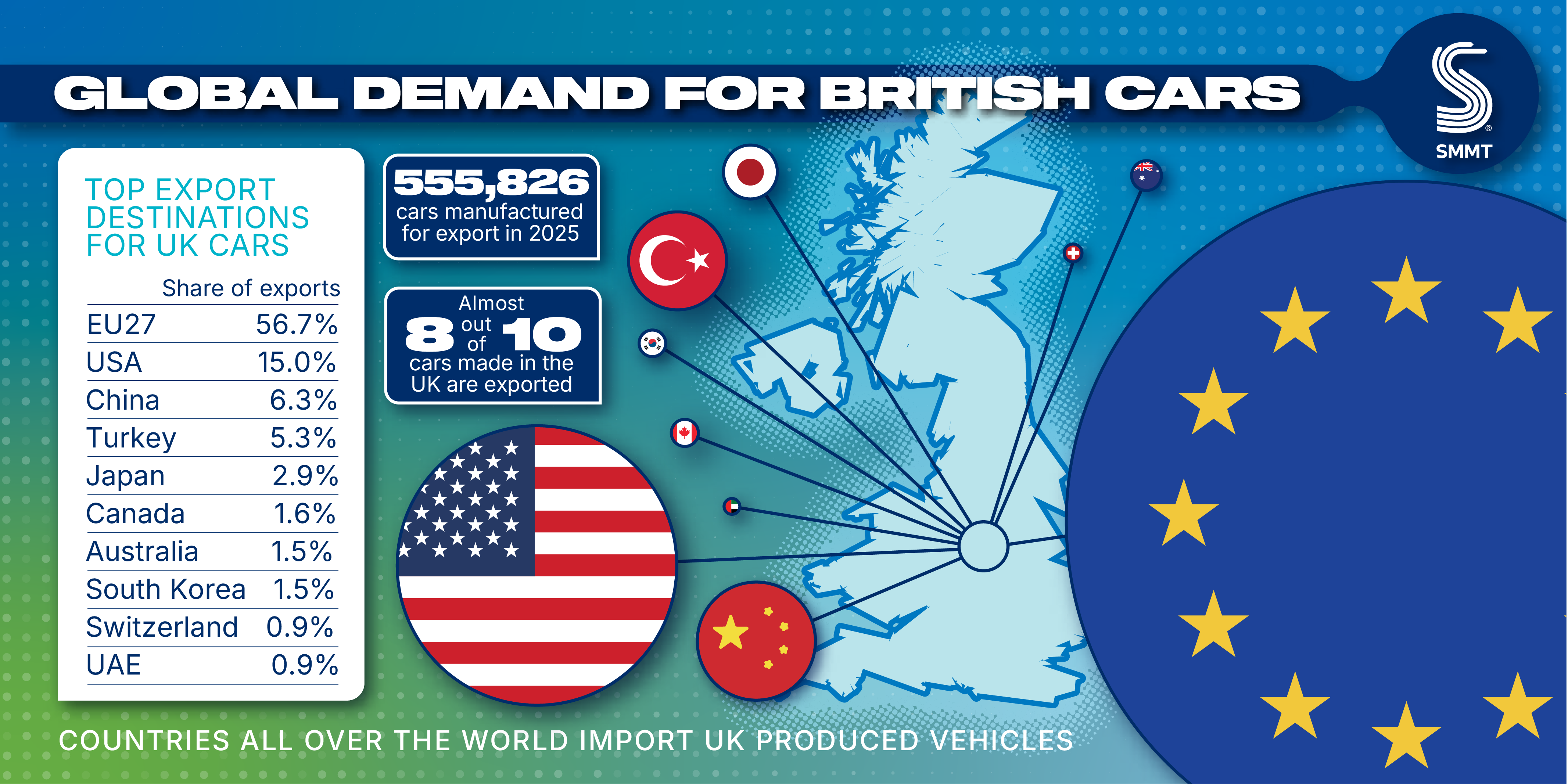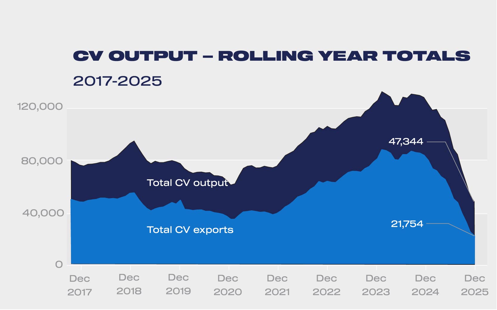 UK vehicle production fell -15.5% in 2025, according to the latest figures published today by the Society of Motor Manufacturers and Traders (SMMT). Factories turned out a total of 764,715 units – 717,371 cars and 47,344 commercial vehicles, with output falling by -8.0% and -62.3% respectively.1 Volumes were constrained by a number of factors, including a cyber incident stopping production at Britain's biggest automotive employer; new tariffs on trade across the Atlantic; the consolidation of two CV plants into one; and ongoing restructuring as plants shift to a decarbonised future. December saw van, truck, bus and coach volumes decline for a ninth consecutive month, falling -67.7% to 2,281 units, but car production showed signs of recovery, rising 17.7% to 53,003 units and ending four months of decline. Over the year, car production for the UK market fell by -8.2% to 161,545 units while exports declined -7.9% to 555,826 units, accounting for 77.5% of output. Europe received the majority (56.7%) of vehicles exported, followed by the US (15.0%) and China (6.3%). Exports to each were down, by -3.3%, -18.3% and -12.5% respectively – with shipments to the US impacted by tariff uncertainty earlier in 2025. Turkey and Japan rounded off the UK's top five global export markets, followed by Canada, Australia, South Korea, Switzerland and UAE. Production of battery electric (BEV), plug-in hybrid (PHEV) and hybrid (HEV) cars rose by 8.3% to a combined 298,813 units – a record 41.7% share of output. With the start of next generation volume electric car production in Sunderland, and the planned launch of seven new EV models across the UK, output is expected to grow in 2026. The latest independent production outlook expects overall UK car production to return to growth with output set to rise by more than 10% to some 790,000 units in 2026. Overall light vehicle production is anticipated to reach 824,000 units – with the potential to reach one million units by 2027 provided new model launches stay on track and the right conditions are set.2 Significant public and private investment has already been committed to the UK's EV transition – with government's £4 billion DRIVE35 programme launched as part of its Modern Industrial Strategy. Achieving the Strategy's ambition of UK automotive production reaching over 1.3 million per year by 2035 now depends on the delivery of the commitments set out in the Strategy. These include measures to drive down the UK's stubbornly high cost of energy, ensuring the whole sector is eligible for the British Industrial Competitiveness Scheme, support for the UK supply chain, and the creation of a strong and sustainable domestic market. Given that manufacturers – and therefore suppliers – build close to where they sell, the importance of a healthy new vehicle market cannot be overstated. A forward-looking trade agenda that deepens existing relationships and builds new ones is also fundamental to what is an export-led industry. Europe remains the UK's biggest automotive export market and the biggest source of imported vehicles and components, so tariff-free trade and market access must be assured, despite a looming change to Rules of Origin requirements agreed under the Brexit deal and increasingly protectionist ‘Made in Europe' proposals coming from the European Commission. Furthermore, given the crucial role of US exports – especially to small volume, high value manufacturers – further uncertainty in cross-Atlantic trade has to be avoided while the benefits arising from new deals with South Korea and India must be realised. Above all, the UK must continue to promote the sector's expertise and capability vigorously to a global audience. Mike Hawes, SMMT Chief Executive, said, “2025 was the toughest year in a generation for UK vehicle manufacturing. Structural changes, new trade barriers, and a cyber attack that stopped production at one of the UK's most important manufacturers combined to constrain output, but the outlook for 2026 is one of recovery. The launch of a raft of new, increasingly electric, models and an improving economic outlook in key markets augur well. The key to long term growth, however, is the creation of the right competitive conditions for investment; reduced energy costs; the avoidance of new trade barriers; and a healthy, sustainable domestic market. Government has set out how it will back the sector with its Industrial and Trade strategies, and 2026 must be a year of delivery.”