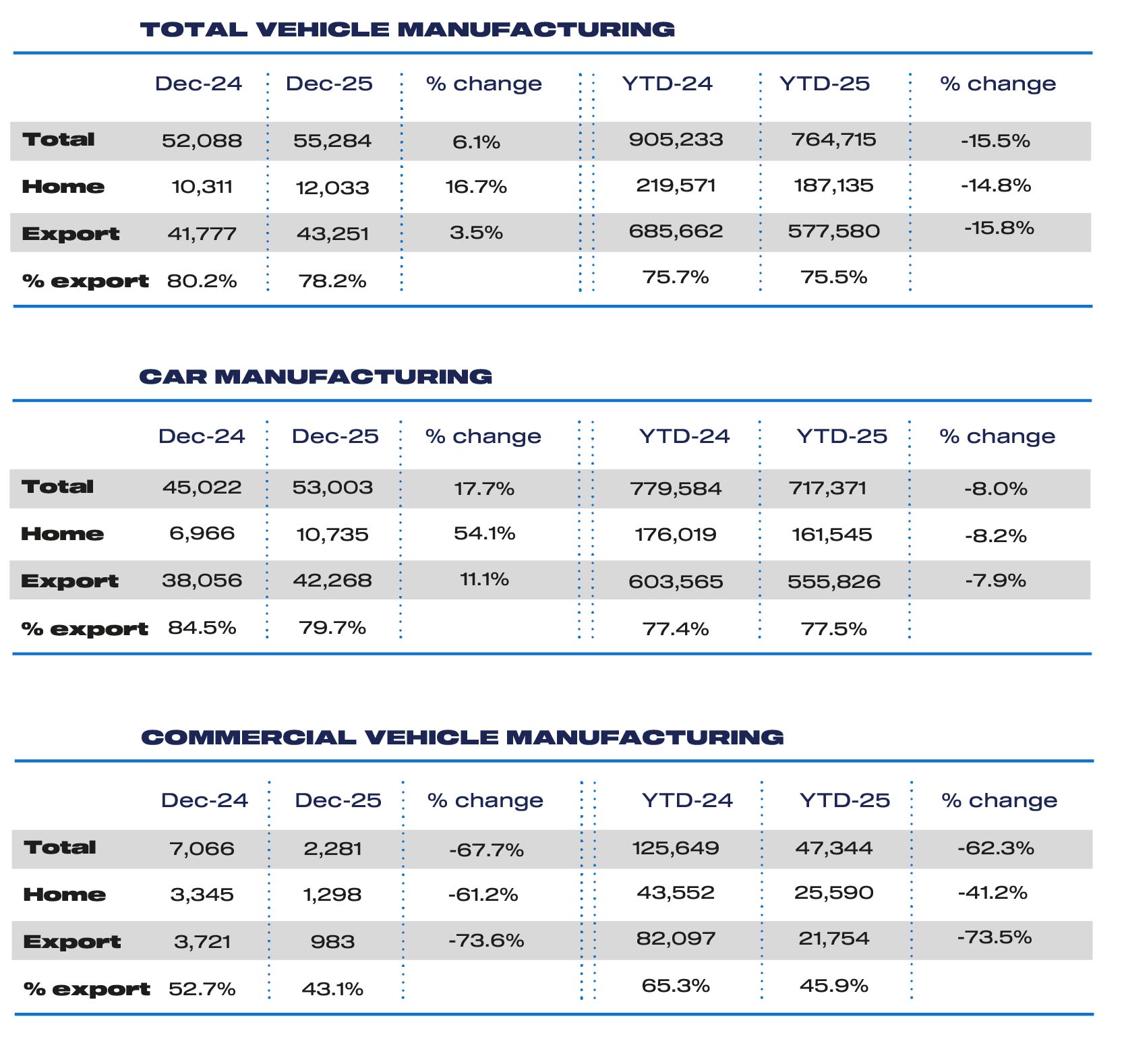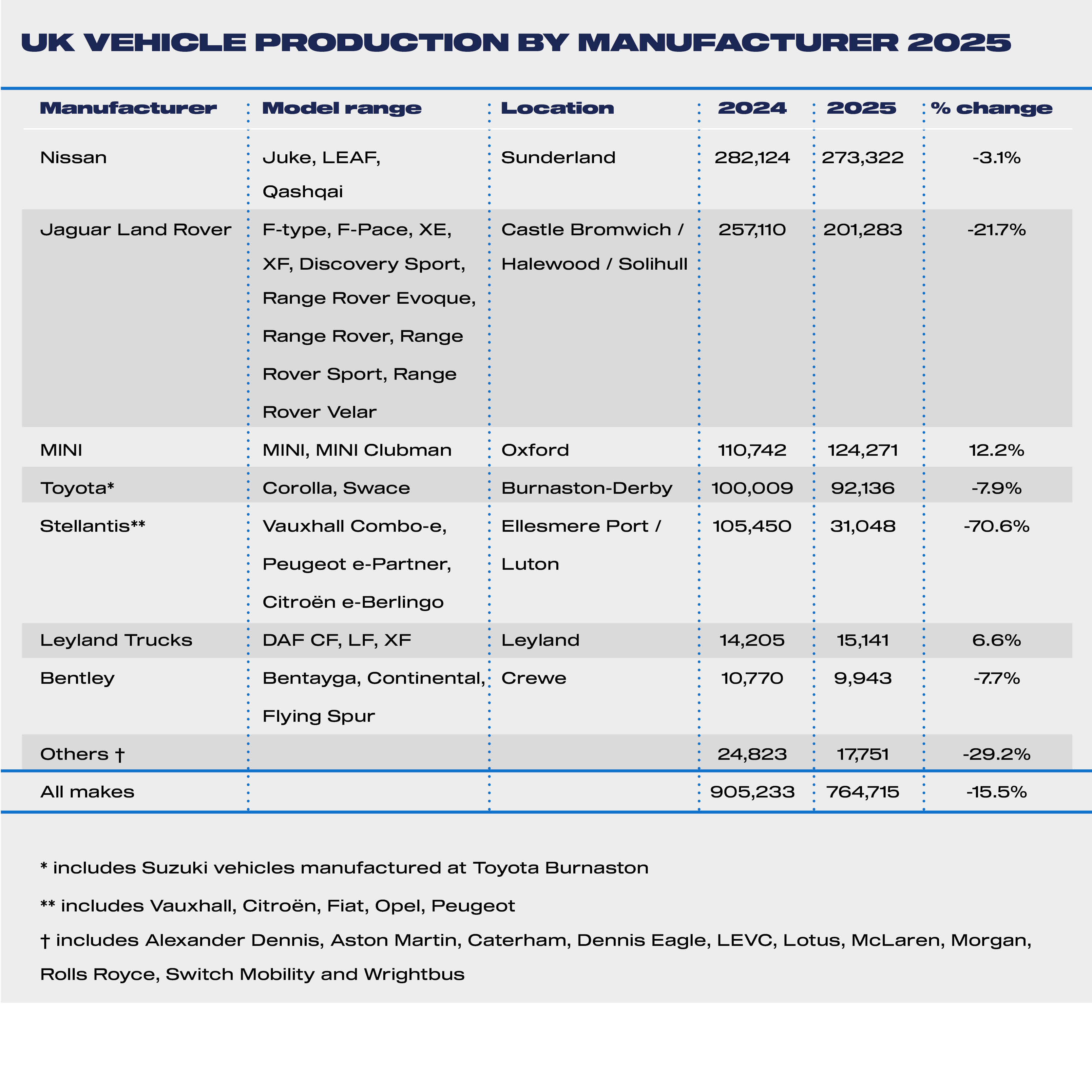 Vehicle production down -15.5% in 2025 as 764,715 cars and