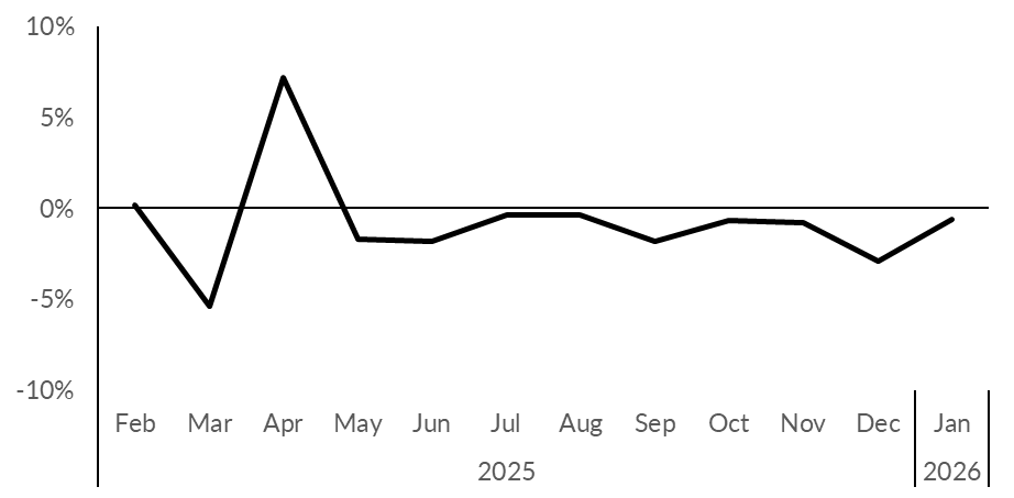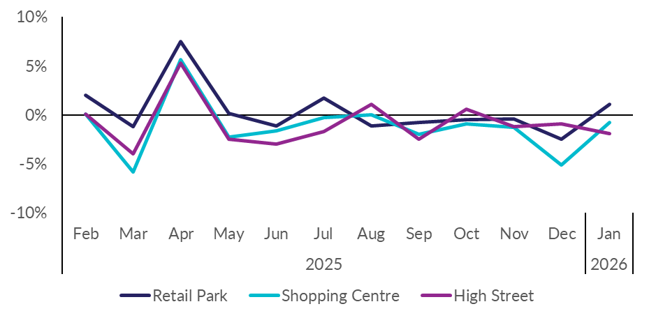 Covering the four weeks 04 - 31 Jan 2026 According to BRC-Sensormatic data: Total UK footfall decreased by 0.6% in January (YoY), up from -2.9% in December. High Street footfall decreased by 1.9% in January (YoY), down from -0.9% in December. Retail Park footfall increased by 1.1% in January (YoY), up from -2.5% in December. Shopping Centre footfall decreased by 0.8% in January (YoY), up from -5.1% in December....Request free trial